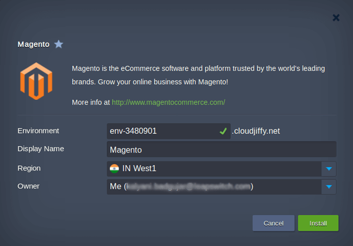 In the opened confirmation window at Cloudjiffy dashboard, type the Environment name, optionally, customize its Display Name. Then, select the preferable region (if several are available) and click on Install.